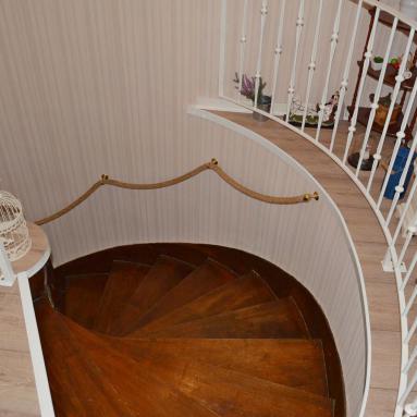 Grand espace calme, desservi par un majestueux escalier de bois.