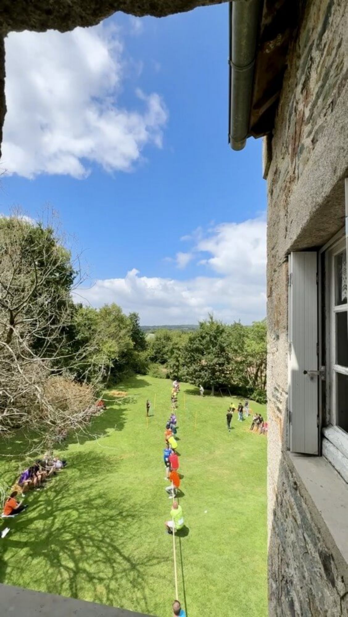 toile de fond un grand mur en pierre et de magnifiques arbres.