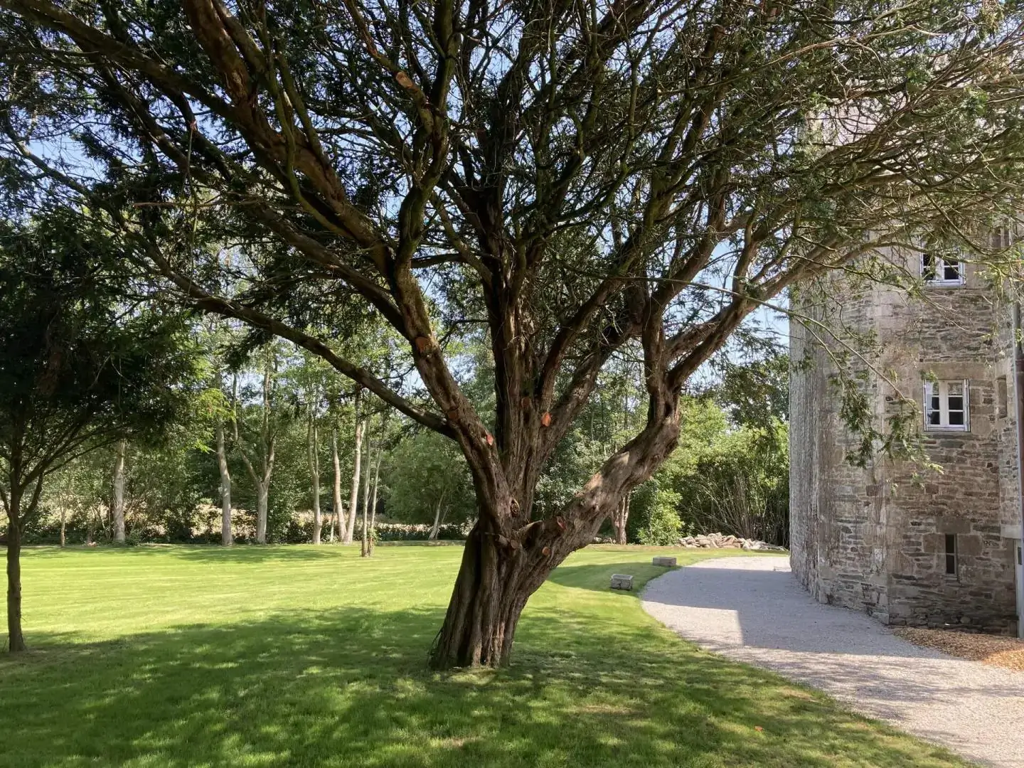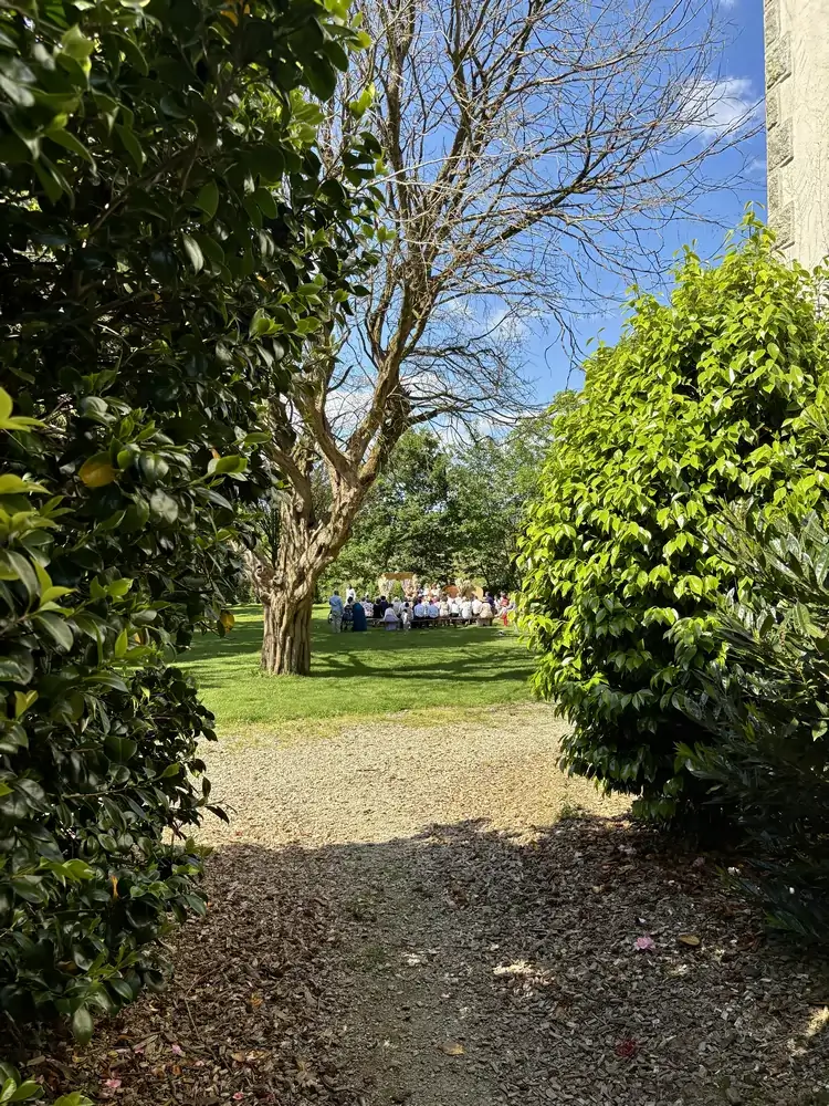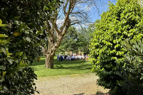 À l’arrière du Manoir, notre parc arboré s’étend dans un écrin de verdure, avec en
